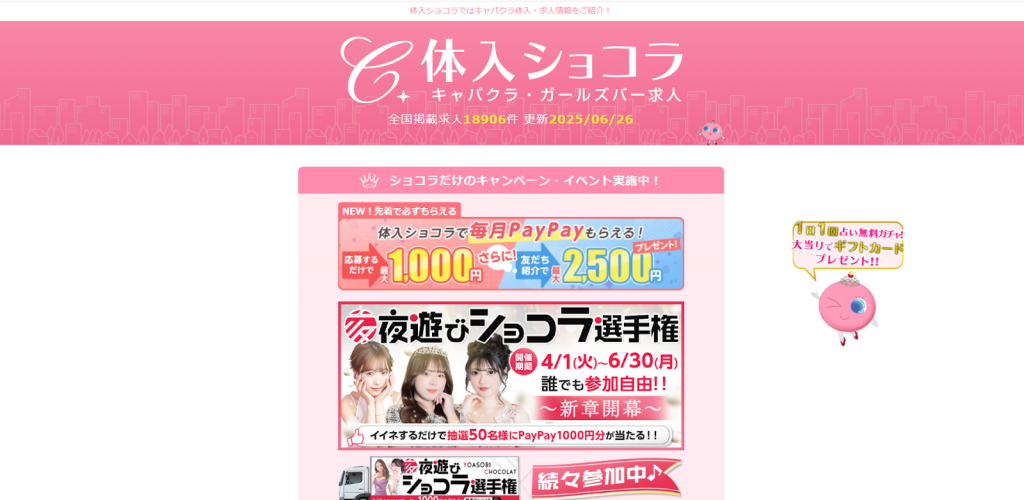 体入ショコラは、業界内でも高い認知度を誇る女性向けのナイトワーク求人サイトで、未経験者から経験者まで対応可能な幅広い求人情報を提供しています。