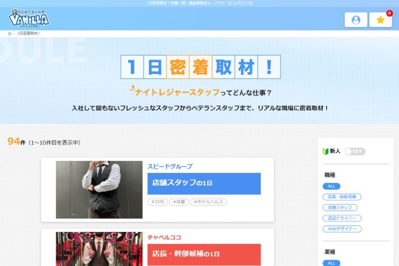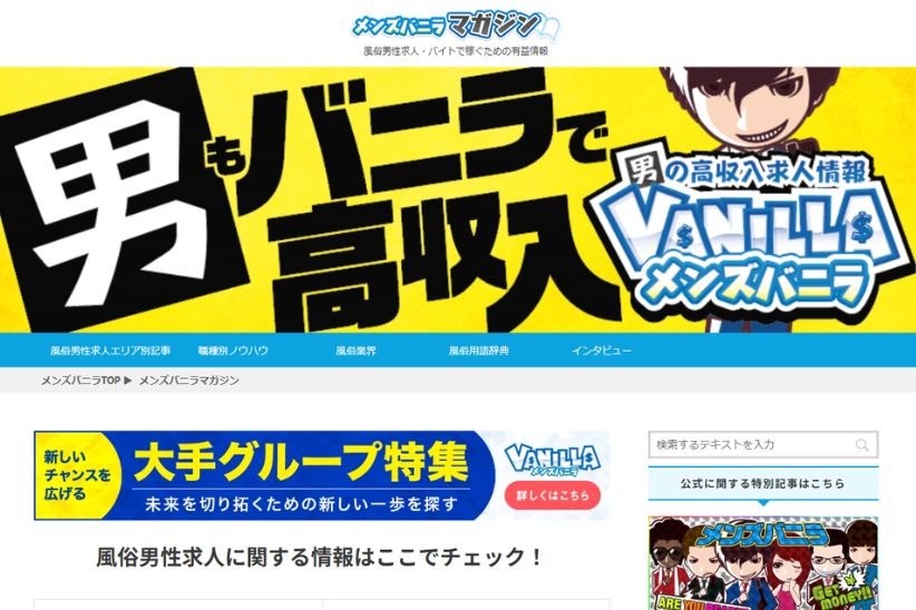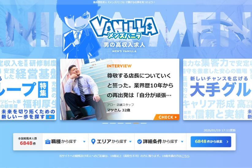 メンズバニラは、男性向けの高収入求人に特化した国内最大級の求人広告サイトです。