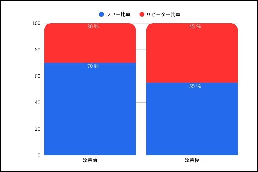 一方で改善後はリピーター比率を45%まで引き上げることに成功しました。