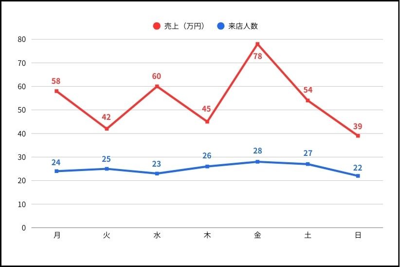 | 客単価の推移 | ・1人あたりの売上単価 ・曜日別/月別の単価 | ・単価低下の原因特定(客層変化/接客・提案不足など) |